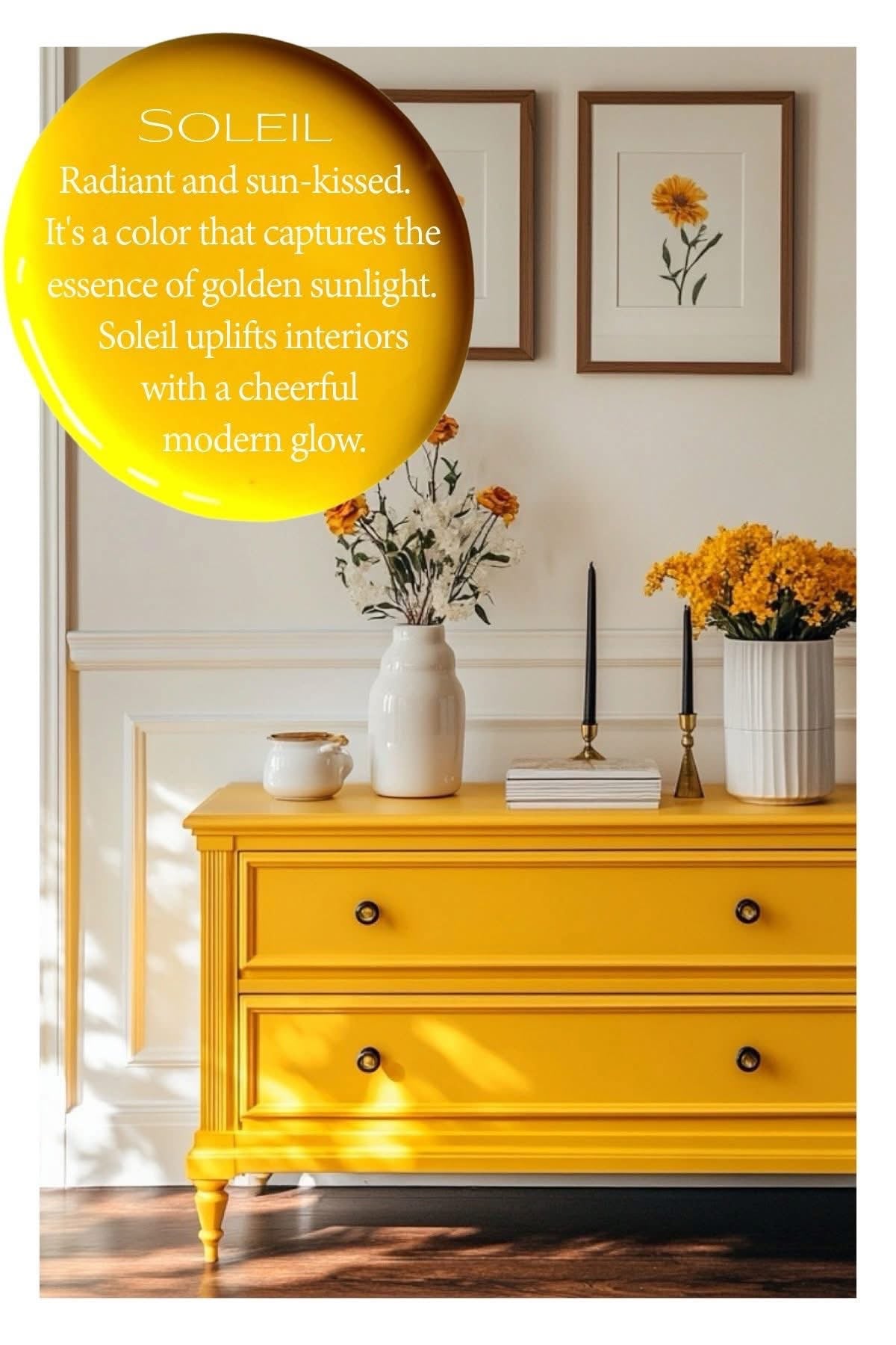 Soleil is radiant and sun kissed. It's a color that captures the essence of golden sunlight. Soleil paint, a bright, golden-yellow shade with sunny orange notes, is ideal for uplifting interiors for a cheerful, modern glow.